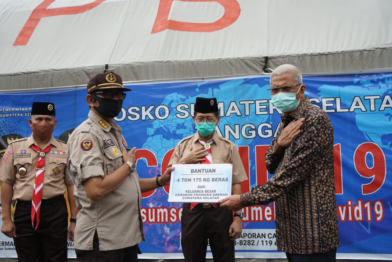 Bertempat di Halaman Posko Penanganan Covid19 Kantor Gubernur Sumsel, Jumat (8/5), bantuan yang diberikan Ketua Gerakan Pramuka Kwartir Daerah Sumsel Mukti Sulaiman diterima langsung oleh Wakil Gubernur Sumsel Mawardi Yahya berupa beras sebanyak kurang lebih 4 ton 175 kg yang akan diberikan kepada masyarakat terdampak Covid19 di Sumsel.