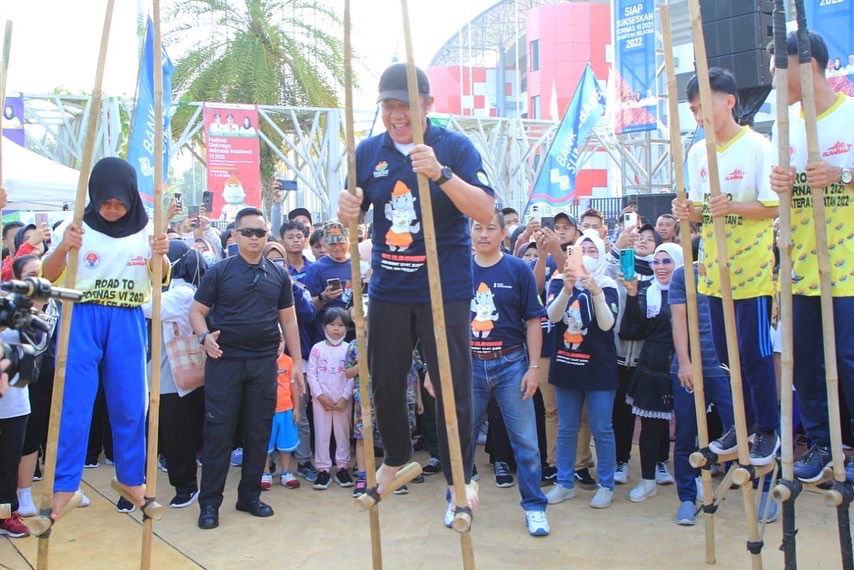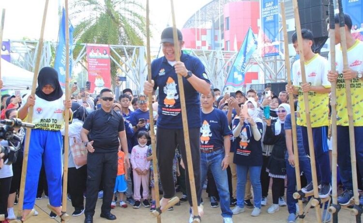 Acara semakin meriah karena Gubernur Sumsel H. Herman Deru turun langsung menjajal permainan egrang serta senam gembira bersama warga Sumsel.