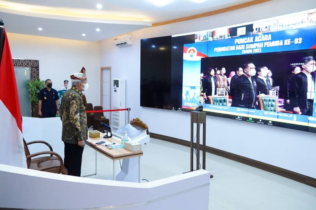 PALEMBANG BARU, PALEMBANG – Wakil Gubernur Provinsi Sumatera Selatan (Sumsel) H. Mawardi Yanya mengikuti puncak peringatan  Hari Sumpah Pemuda (HSP) Ke-93 tahun 2021 secara virtual, bertempat di  Command Center Kantor Gubernur Sumsel (28/10).