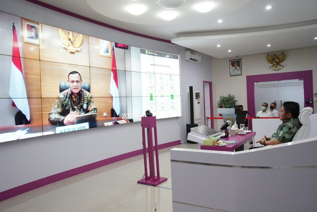 PALEMBANG BARU – Mengawali agenda kegiatannya Rabu (24/6) pagi, Gubernur Sumsel H.Herman Deru mengikuti Rapat Koordinasi Pencegahan dan Pemberantasan Korupsi KPK dan Seluruh Gubernur se Indonesia diselenggarakan oleh Komisi Pemberantasan Korupsi (KPK) RI melalui video conference aplikasi zoom, dari Command Centre Pemprov Sumsel.