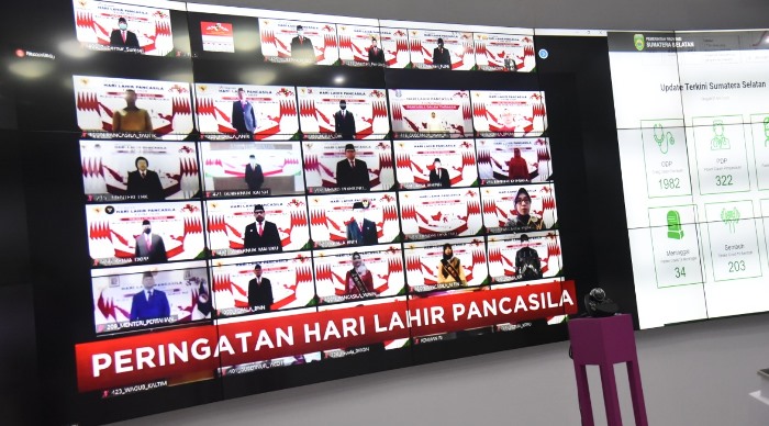 PALEMBANG BARU – Meski dalam masa pandemi Corona, Gubernur Sumsel H. Herman Deru tetap mengikuti upacara Hari Pancasila yang jatuh pada Senin, 1 Juni 2020. Gubernur HD mengikuti upacara secara langsung melalui Video Conference yang diselenggarakan oleh Badan Pembina Ideologi Pancasila bertempat di Command Center Kantor Gubernur Sumsel.