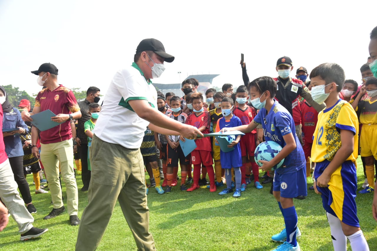 Dalam kesempatan itu Gubernur HD tak hanya menyerahkan bola secara simbolis sebagai bagian dari program sejuta bola. Namun Ia juga memberikan sertifikat kepada semua peserta. Bahkan melakukan kick off dan menjajal lima alat pemotong rumput teranyar yang dihadirkan Direktur Utama JSC.