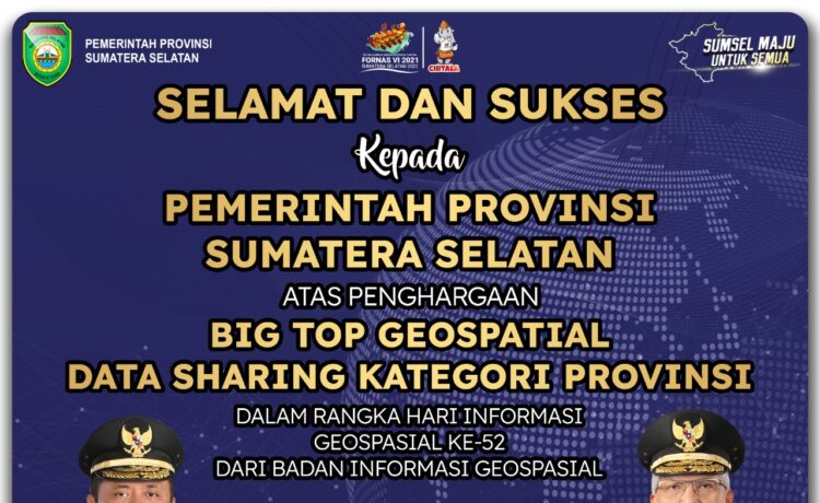 PALEMBANG BARU, BOGOR – Pemerintah Provinsi Sumatera Selatan (Sumsel) dibawah kepemimpinan Gubernur H Herman Deru kembali menorehkan prestasinya ditingkat nasional. Terbaru Pemprov Sumsel mendapatkan penghargaan “Big Top Geospasial Data Sharing Kategori Provinsi” dari Badan Informasi Geospasial (BIG) RI.