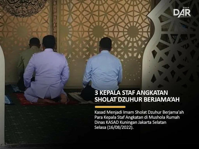JAKARTA, PB – Tiga pimpinan matra TNI berkumpul di kediaman Kepala Staf Angkatan Darat (KSAD) Jenderal TNI Dudung Abdurrahman usai mengikuti pidato kenegaraan Presiden Joko Widodo (Jokowi), Selasa (16/8/2022). Selain KSAD ada Kepala Staf Angkatan Laut (KSAL) Laksamana Yudo Margono dan Kepala Staf Angkatan Udara (KSAU) Marsekal Fadjar Prasetyo dalam pertemuan itu.