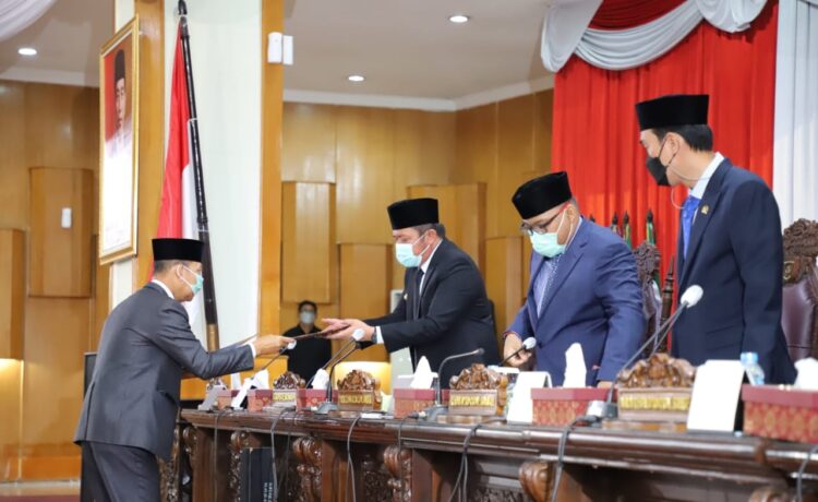 Diakhir Rapat Paripurna XXVII DPRD Provinsi Sumsel dengan Agenda Perubahan dan Penambahan Program Pembentukan Peraturan Daerah Tahun 2021 dilakukan penandatanganan Keputusan DPRD Provinsi Sumsel oleh Wakil Ketua DPRD Provinsi Sumsel H.M. Giri Ramanda Kiemas yang disaksikan oleh Gubernur Sumsel H Herman Deru.*****