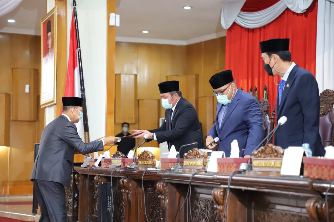 Diakhir Rapat Paripurna XXVII DPRD Provinsi Sumsel dengan Agenda Perubahan dan Penambahan Program Pembentukan Peraturan Daerah Tahun 2021 dilakukan penandatanganan Keputusan DPRD Provinsi Sumsel oleh Wakil Ketua DPRD Provinsi Sumsel H.M. Giri Ramanda Kiemas yang disaksikan oleh Gubernur Sumsel H Herman Deru.*****