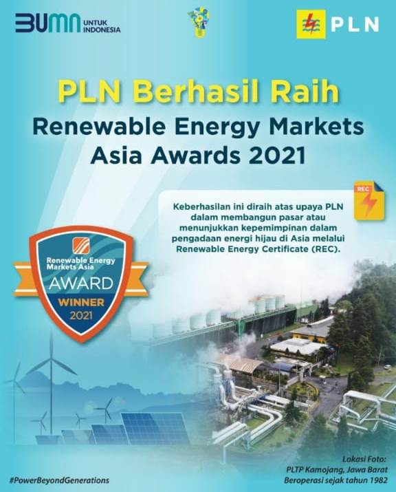 PALEMBANG BARU, Jakarta – PLN meraih penghargaan pada gelaran perdana Renewable Energy Markets™️ (REM™️) Asia Awards. Keberhasilan ini diraih atas upaya PLN dalam membangun pasar atau menunjukkan kepemimpinan dalam pengadaan energi hijau di Asia melalui renewable products services yang di keluarkan oleh PLN, yaitu Renewable Energy Certificate (REC).