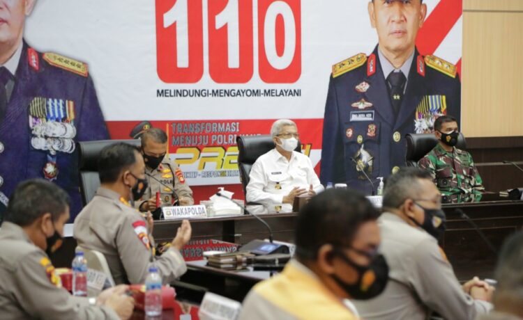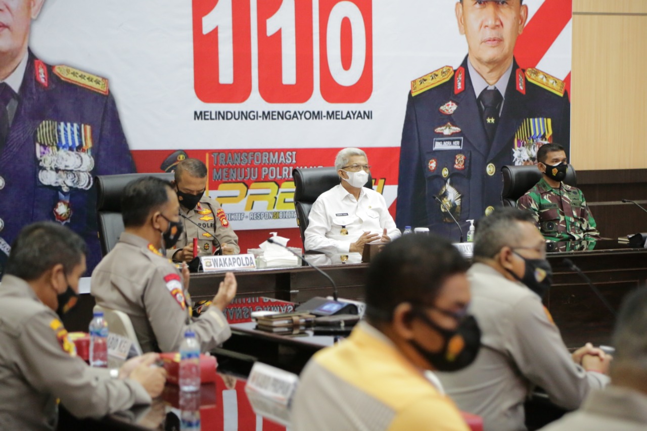 Wakil Gubernur Sumatera Selatan H Mawardi Yahya bersama Wakapolda Sumsel Brigjen Pol Rudi Setyawan dan Kasdam II Sriwijaya Brigjen TNI Muhammad Zamroni menghadiri launching layanan polisi 110 secara virtual dari ruang Rekonfu Mapolda Sumsel.