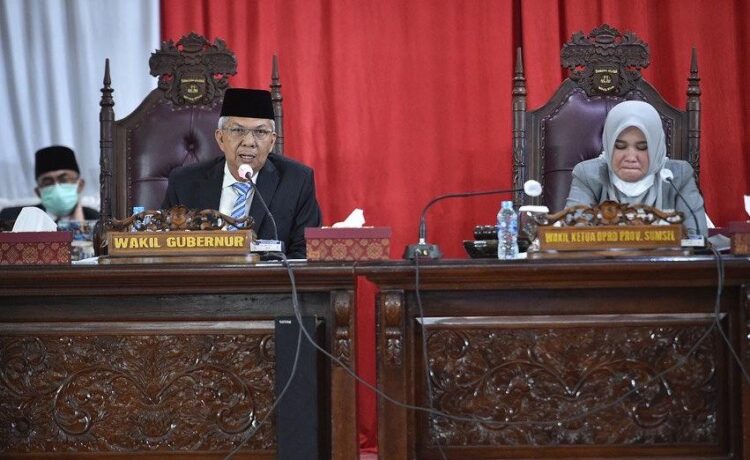 PALEMBANG BARU, PALEMBANG – Wakil Gubernur Sumsel H Mawardi Yahya menyampaikan jawaban Gubernur Sumsel terkait pemandangan umum fraksi-fraksi DPRD Sumsel terhadap Raperda perubahan APBD Provinsi Sumsel tahun anggaran 2021.