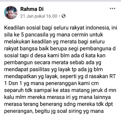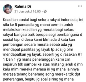 “Sesuai dengan sila kelima, keadilan sosial bagi seluruh rakyat Indonesia, jadi pembangunan harus merata jangan pilih-pilih, lampu jalan di sekitar rumah saya Rt. 1 RW. 1, sudah lama mati tapi sampai sekarang belum diperbaiki, jika gelap tentu rawan terjadi gangguan kantibmas. Olehnya itu kami berharap bukan hanya jalan poros provinsi dan daerah perkotaan yang banjir cahaya, kami juga warga desa ingin seperti itu,” Tulisnya di akun facebooknya Senin (22/6/2020).